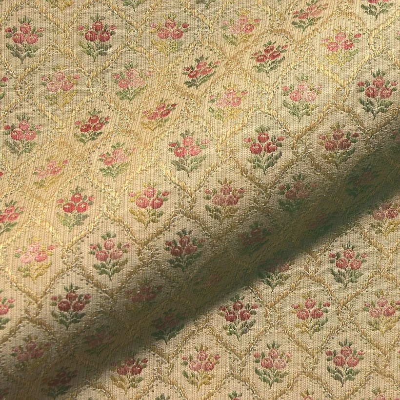 Pienikuvioinen, symmetrinen kukkakuosi tyylikalusteisiin.