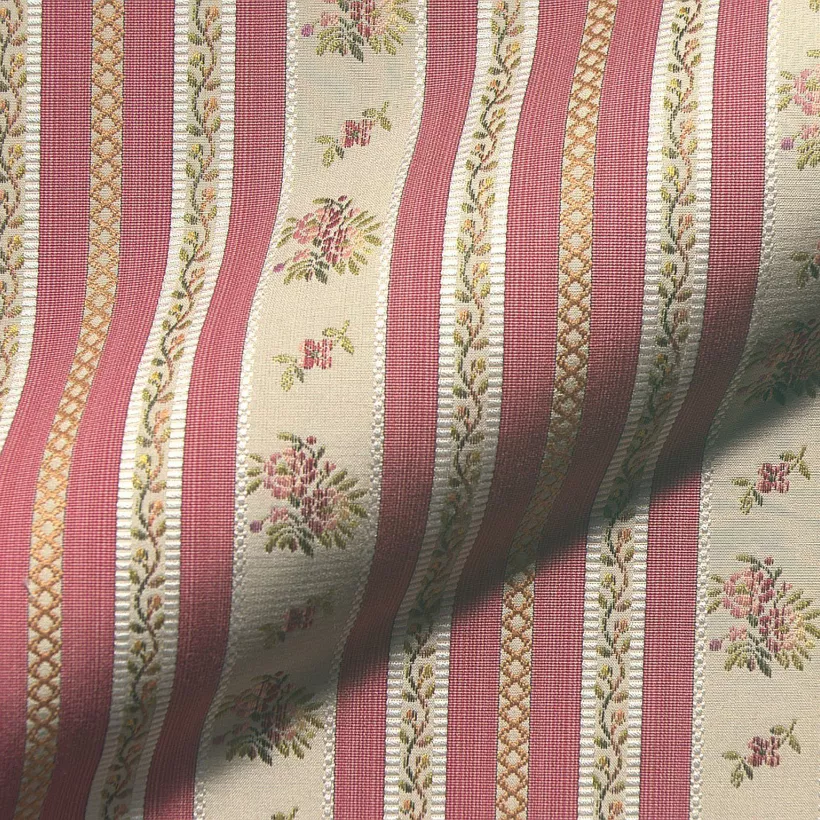 Perinteinen raidallinen kangas tyylikalusteisiin. Raidoissa pieniä kukka- ja köynnöskuvioita.