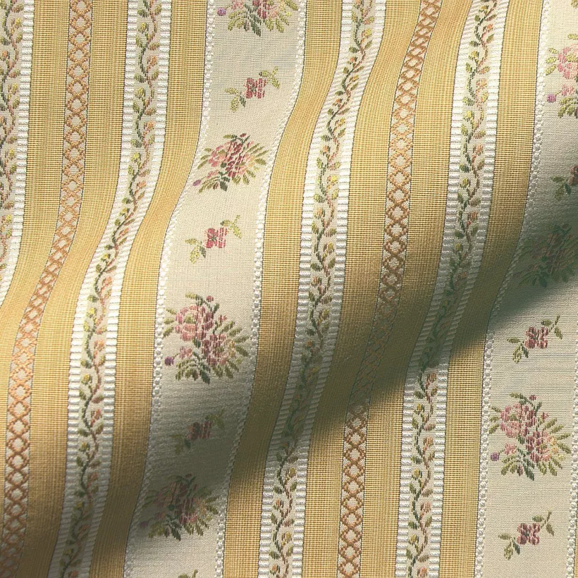 Perinteinen raidallinen kangas tyylikalusteisiin. Raidoissa pieniä kukka- ja köynnöskuvioita.