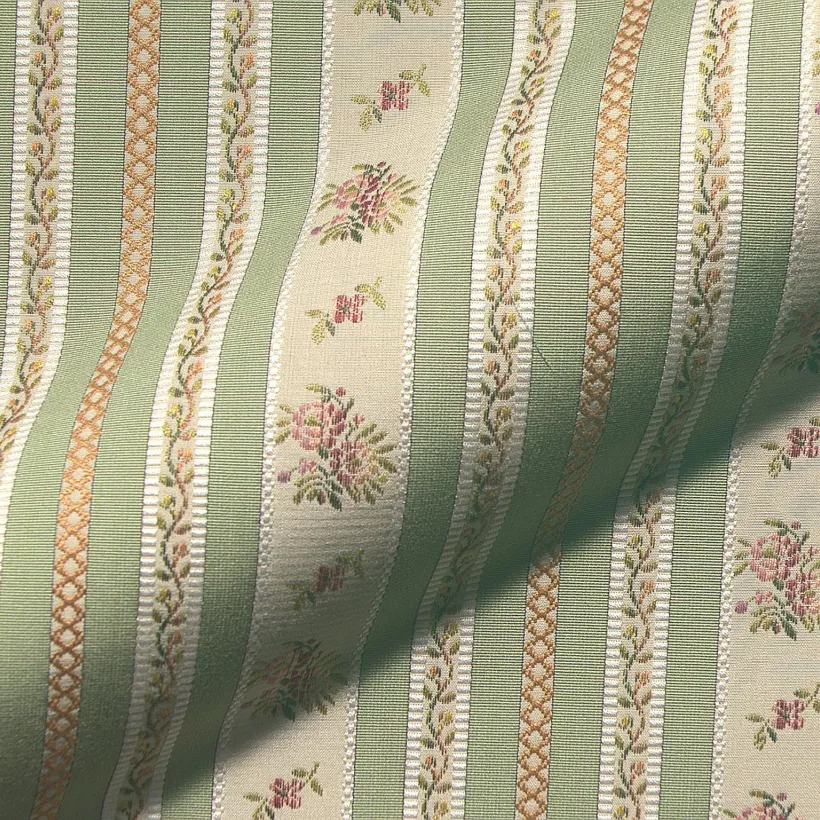 Perinteinen raidallinen kangas tyylikalusteisiin. Raidoissa pieniä kukka- ja köynnöskuvioita.