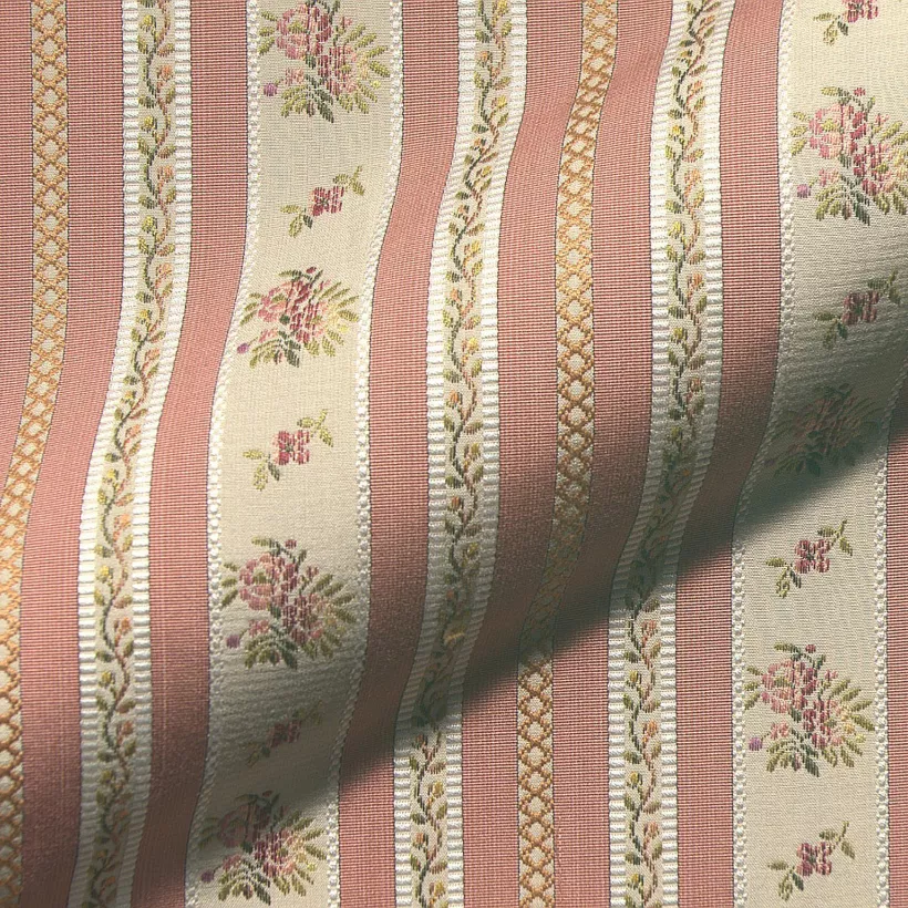 Perinteinen raidallinen kangas tyylikalusteisiin. Raidoissa pieniä kukka- ja köynnöskuvioita.